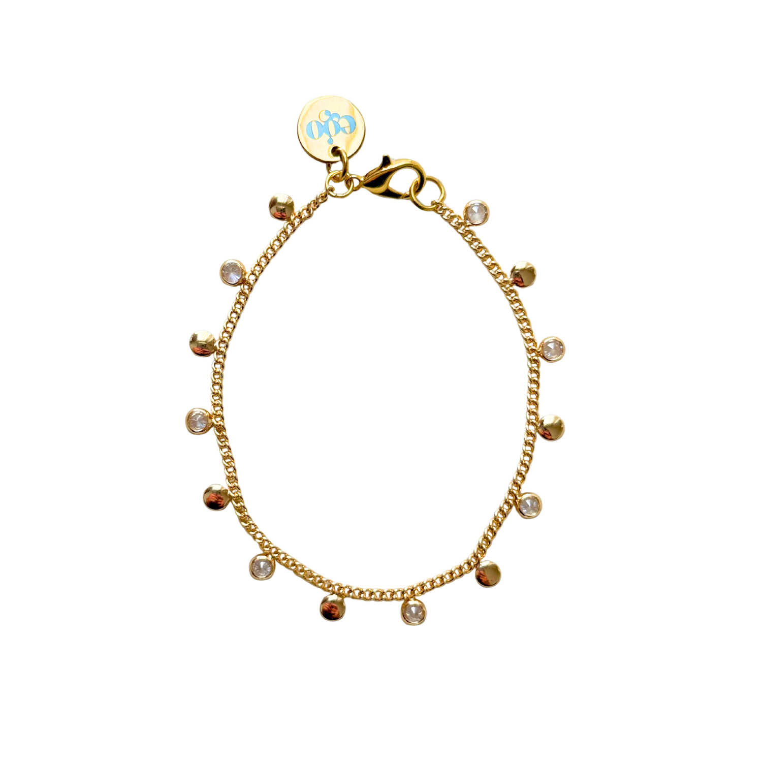 Pulsera compuesta por una fina cadena en tono dorado, adornada con pequeños colgantes circulares que alternan acabados pulidos y cristales. El resultado es una pieza luminosa que aporta movimiento y un sutil destello con cada gesto.